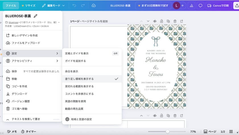 Canva編集リンク.pdfを開き、編集したい画像をクリックしてCanvaの編集画面を開きます。編集画面が開いたら、上部のメニューより【ファイル】→【設定】→【塗り足し領域を表示する】にチェックを入れます。編集したい部分をクリックして、テキストやフォント、文字の大きさなどをお好みで変更します。カードの裏面も同様に編集します。編集できたら、画面の右上の【Canvaで印刷】ボタンを押して印刷設定します。印刷をCanvaで行わない場合は、右上の【共有】ボタンよりPDFやpng画像としてダウンロードできます。