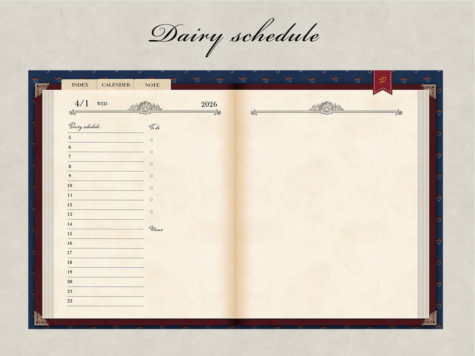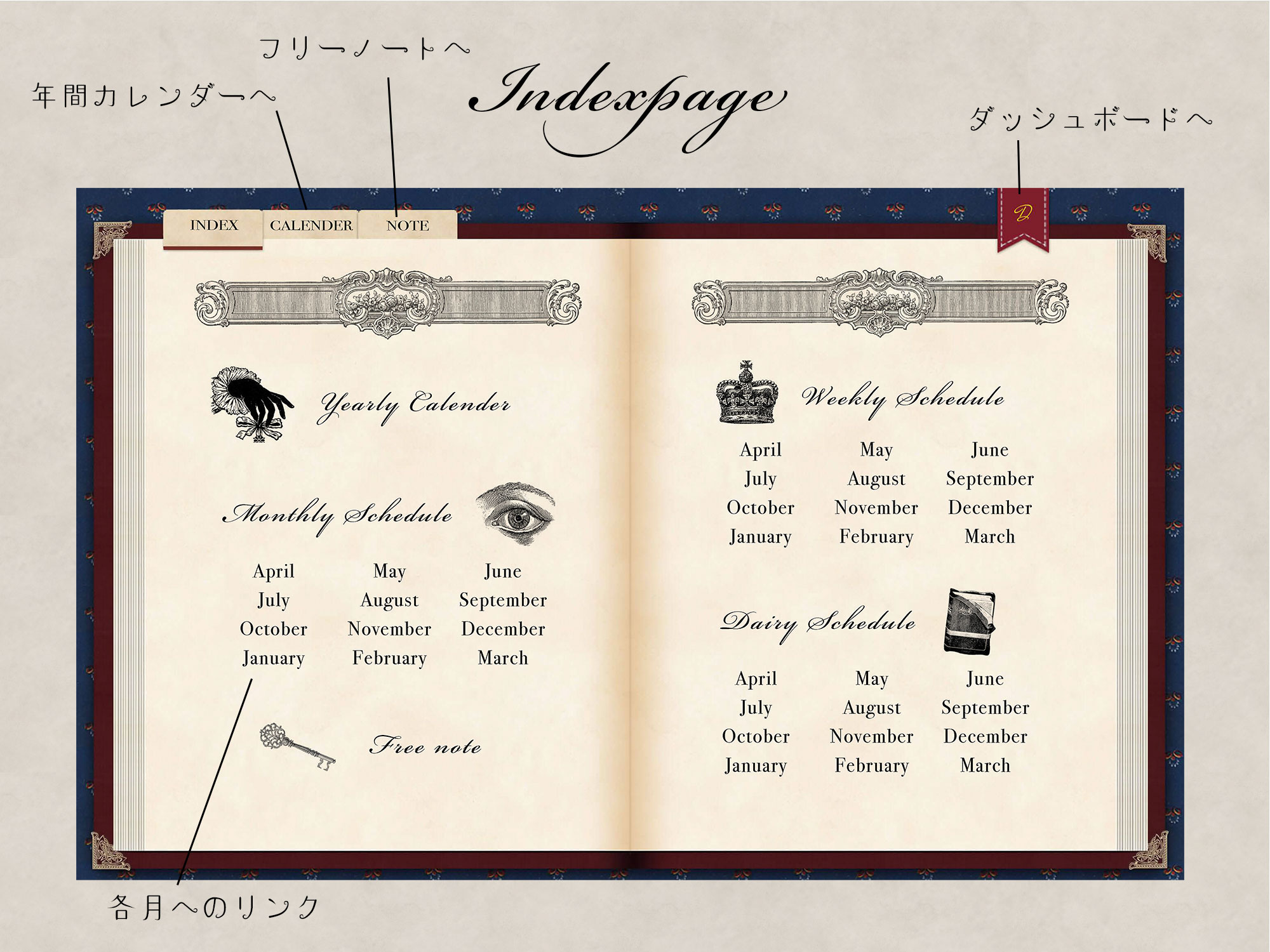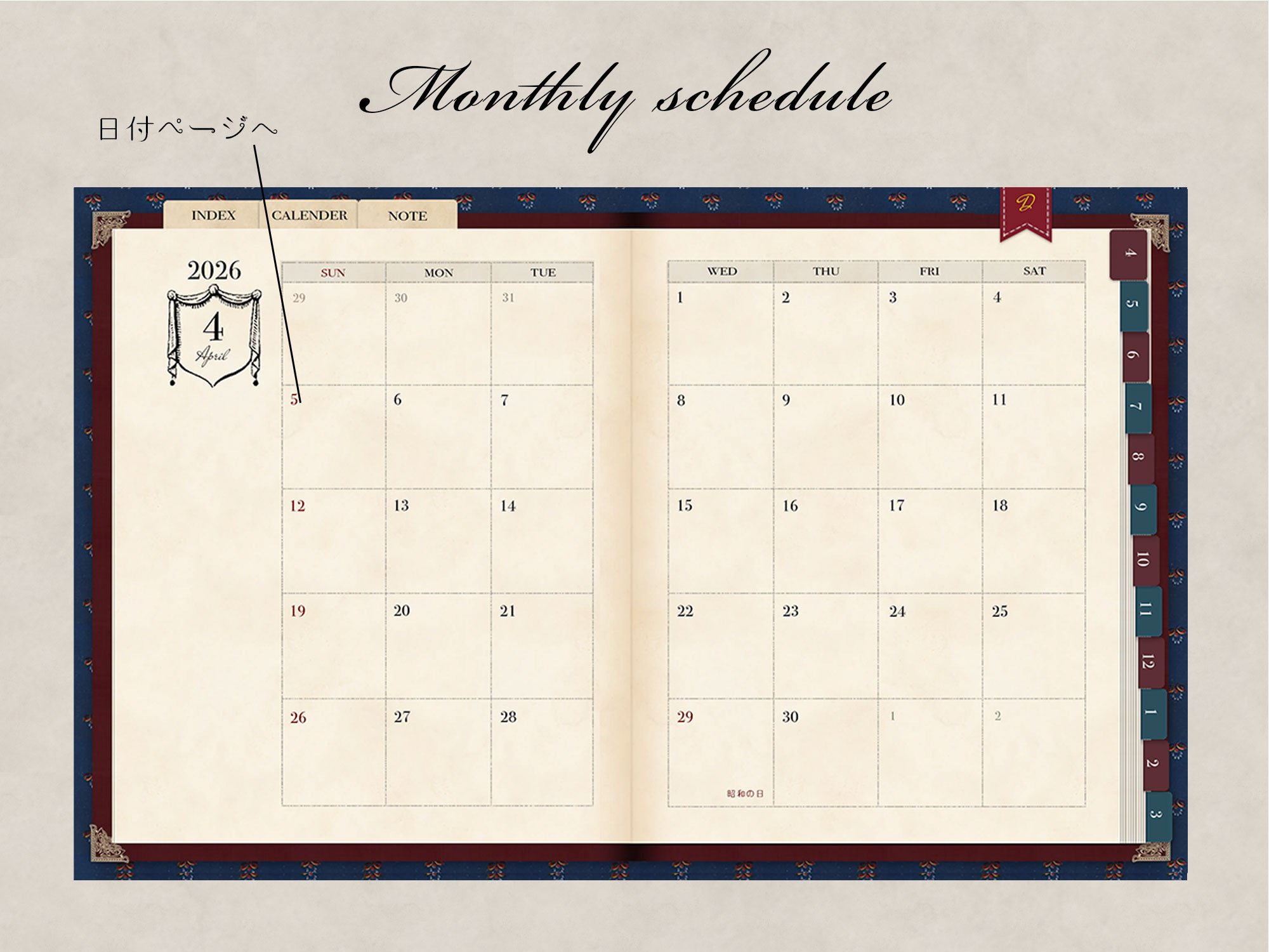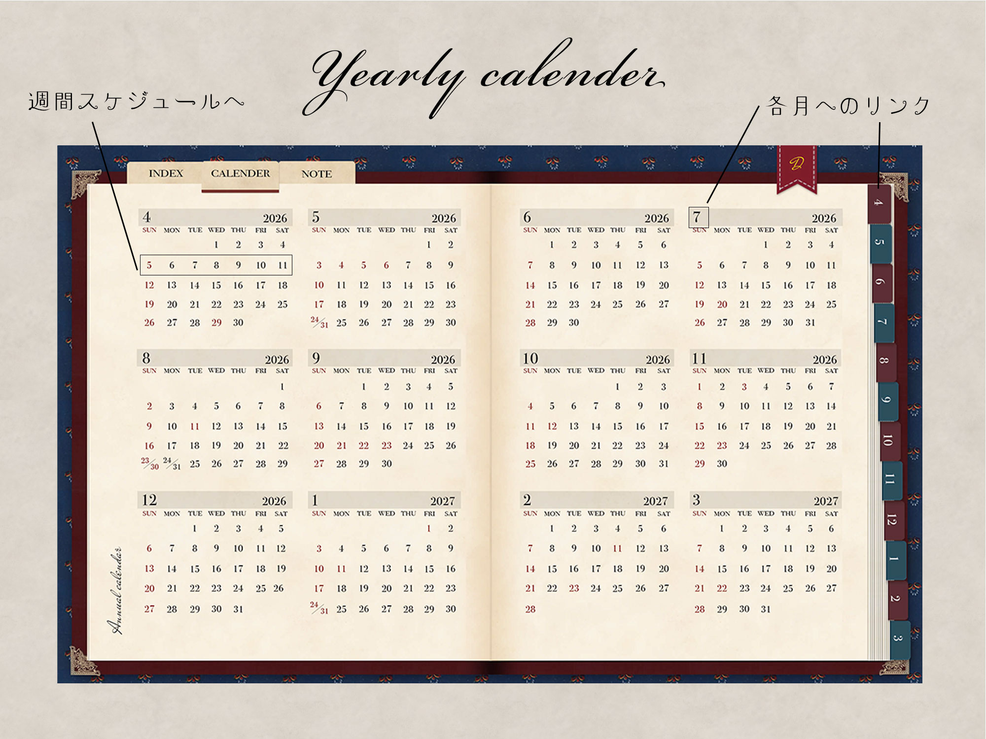 セットには2026年4月から2027年3月までの年間カレンダー、月間カレンダー、週間カレンダー、各日付ページ、