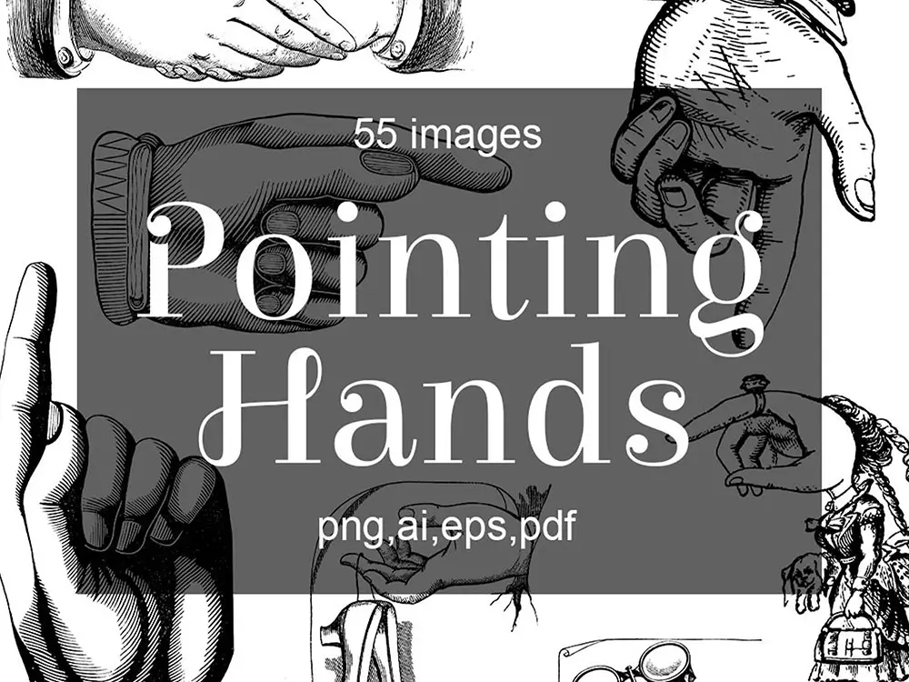 PointingHandsはパブリックドメインのイラストをデザイン素材として加工した透過pngファイルとイラストレーターなどで編集できるai,epsファイルのセットです。